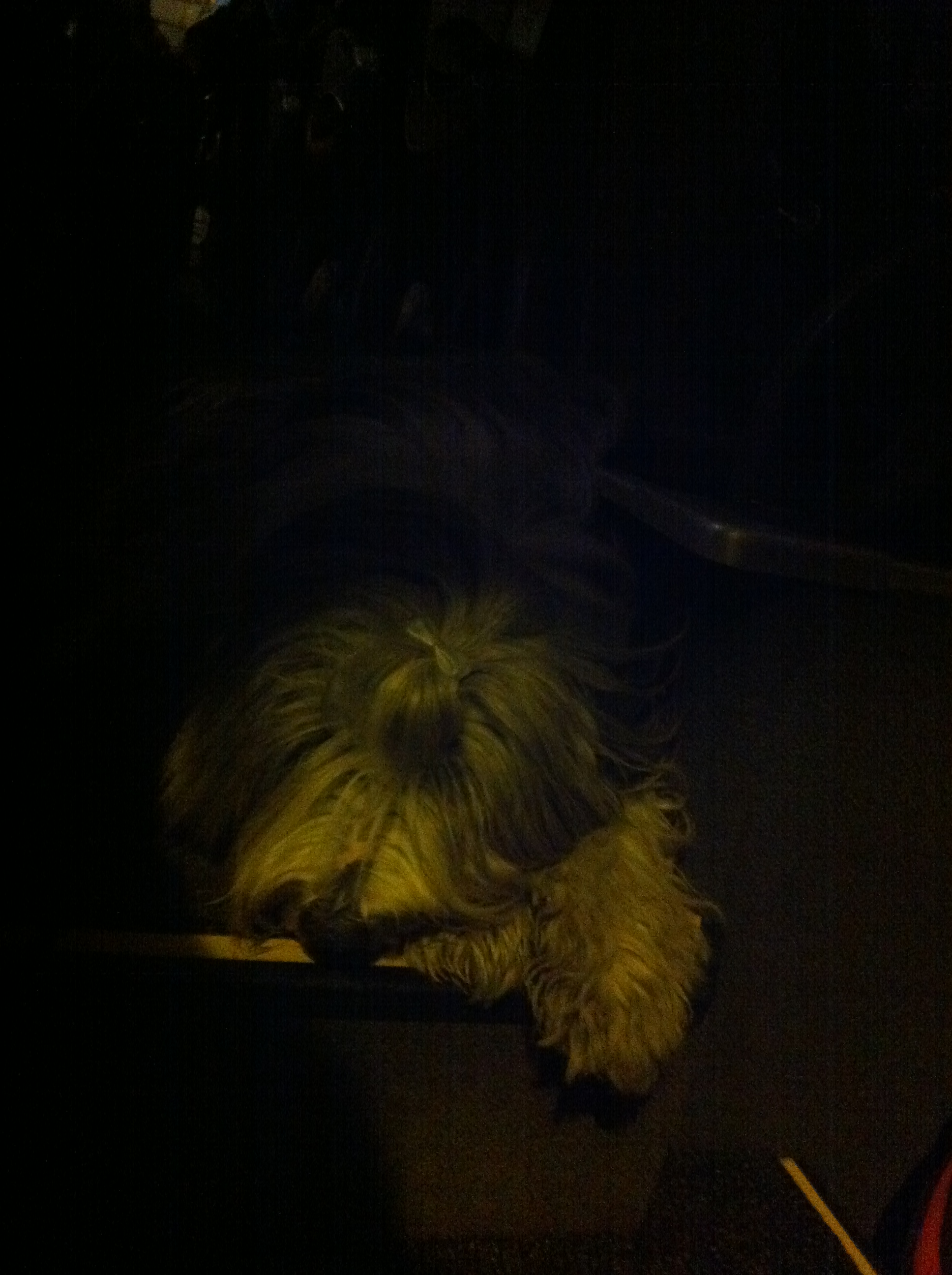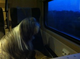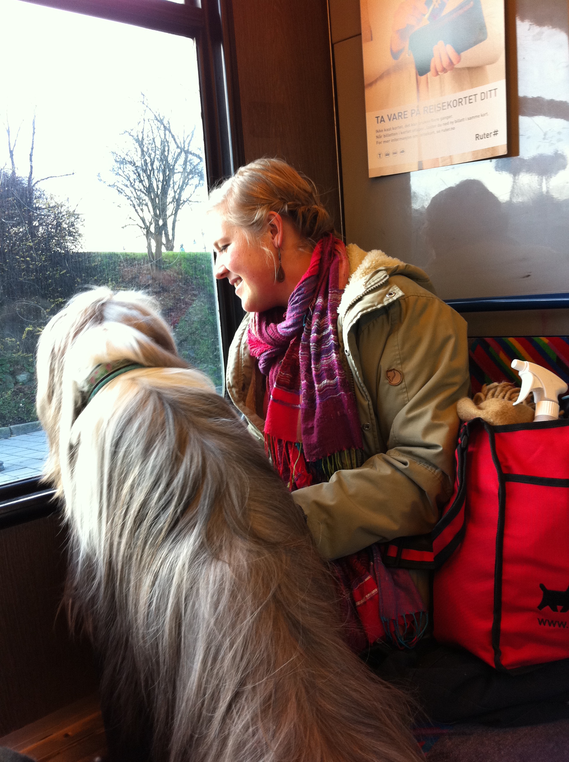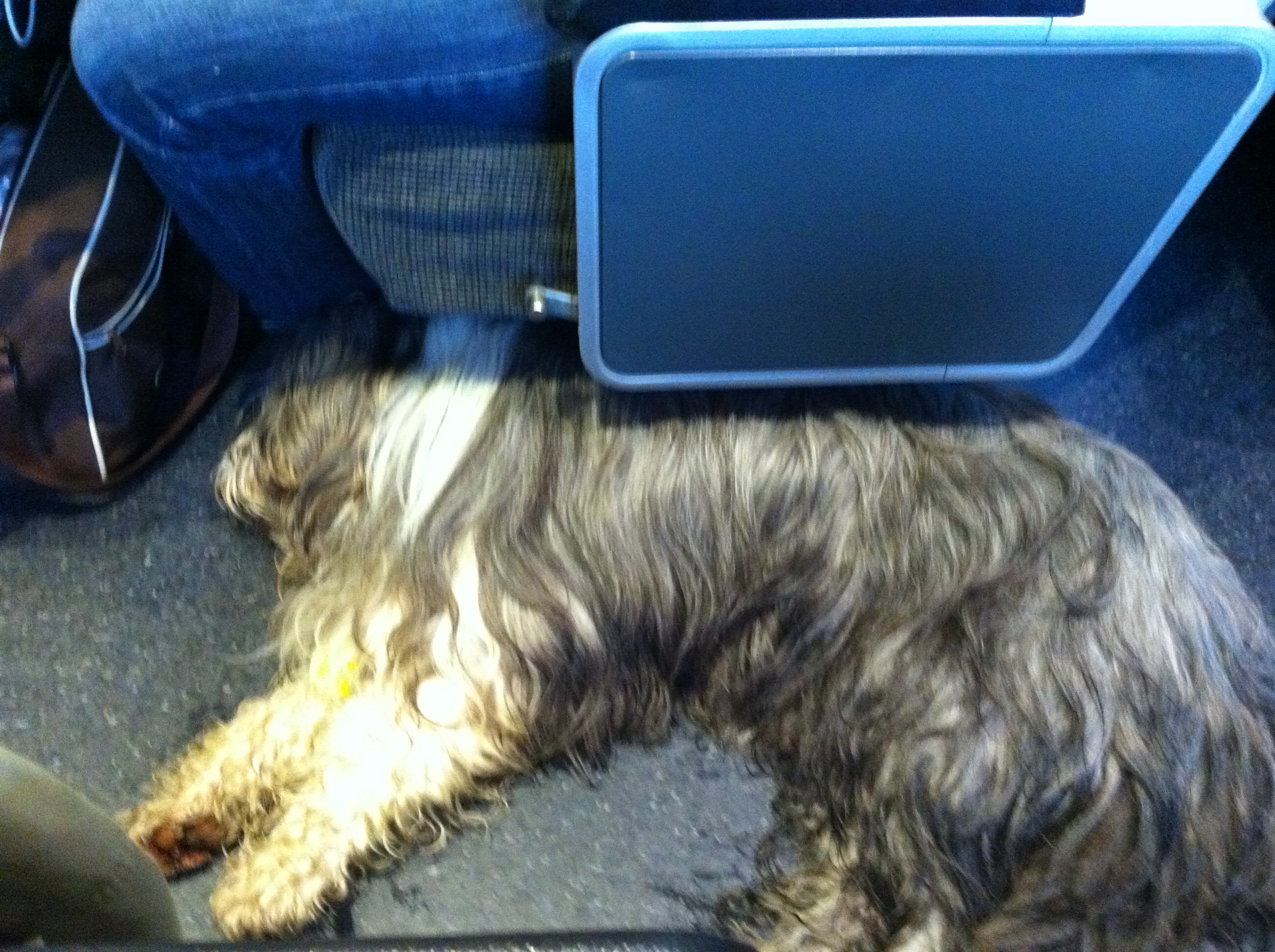 Sally har varit på ett äventyr med Anna. De tog tåget på fredag morgon upp till Oslo för att hälsa på Emma. Sally höll sig cool. Hon låg gärna i gången på tåget, så folk fick kliva över henne när de skulle förbi. På bilden har hon tagit sig friheten att sova på grannens fötter.
