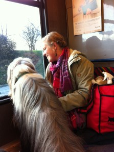 På söndagen skulle Anna och Sally hem, så Emma vinkade av dem vid stationen. De trodde de skulle få en smidig resa, men en liten storm som heter Berit satte stop för det. Då det var snudd på orkanstyrka så gick inte tåget längre än Varberg, och sista sträckan till Halmstad erbjöds ersättningsbussar. Det var smått kaos i Varberg då det var för få bussar beställda och folk blev irriterade och förvirrade. Den snälla buss-schauffören pekade ut i folkmassan och sa ”jag tar henne med hunden”, och vips fick Anna och Sally den sista platsen. Anna fick ta guide-sätet och Sally fick första parkett längst fram i gången på bussen… där hon somnade. Det blev en övernattning hos moster Marita i Halmstad, och på måndag morgon fick de komma hem till matte.