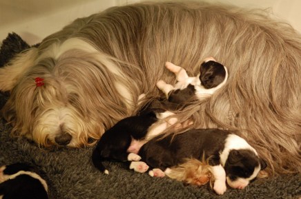 Sally fortsätter att ta väl hand om sina små. När hon har varit borta en längre stund så känner valparna henne på lukten när hon är tillbaks i valplådan. Då blir det full fart för alla vill ha mat. Det är underbart att titta på Sally och valparna när de myser tillsammans.
