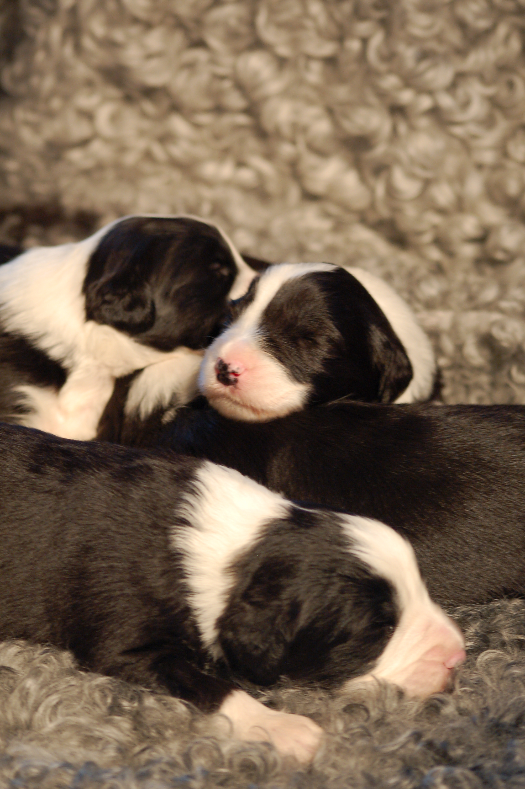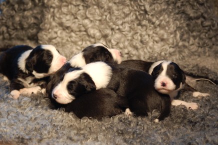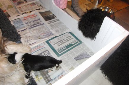 Vår puli Ester tycker att valparna är väldigt spännande. Sally har inte tillåtit henne att komma in i valplådan, men att ligga vid kanten och titta skadar ingen…