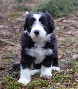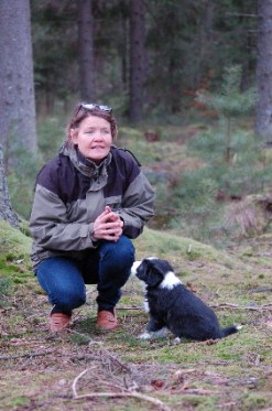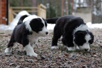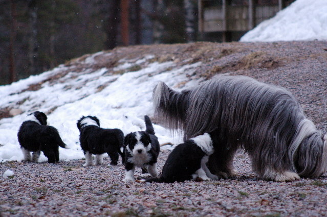 Idag är valparna 6 veckor gamla och vi tog ut dem i granskogen mitt emot huset. Det blev en kort utevistelse för helt plötsligt började det snöa.