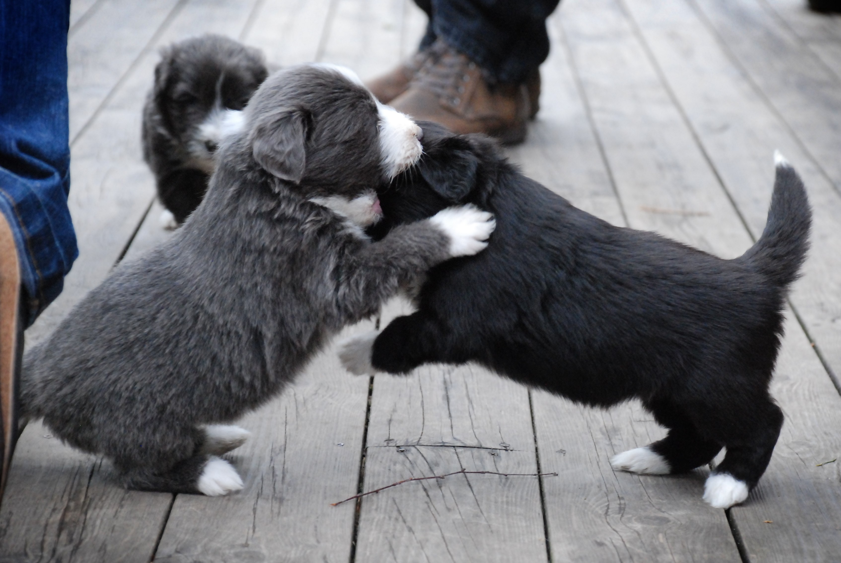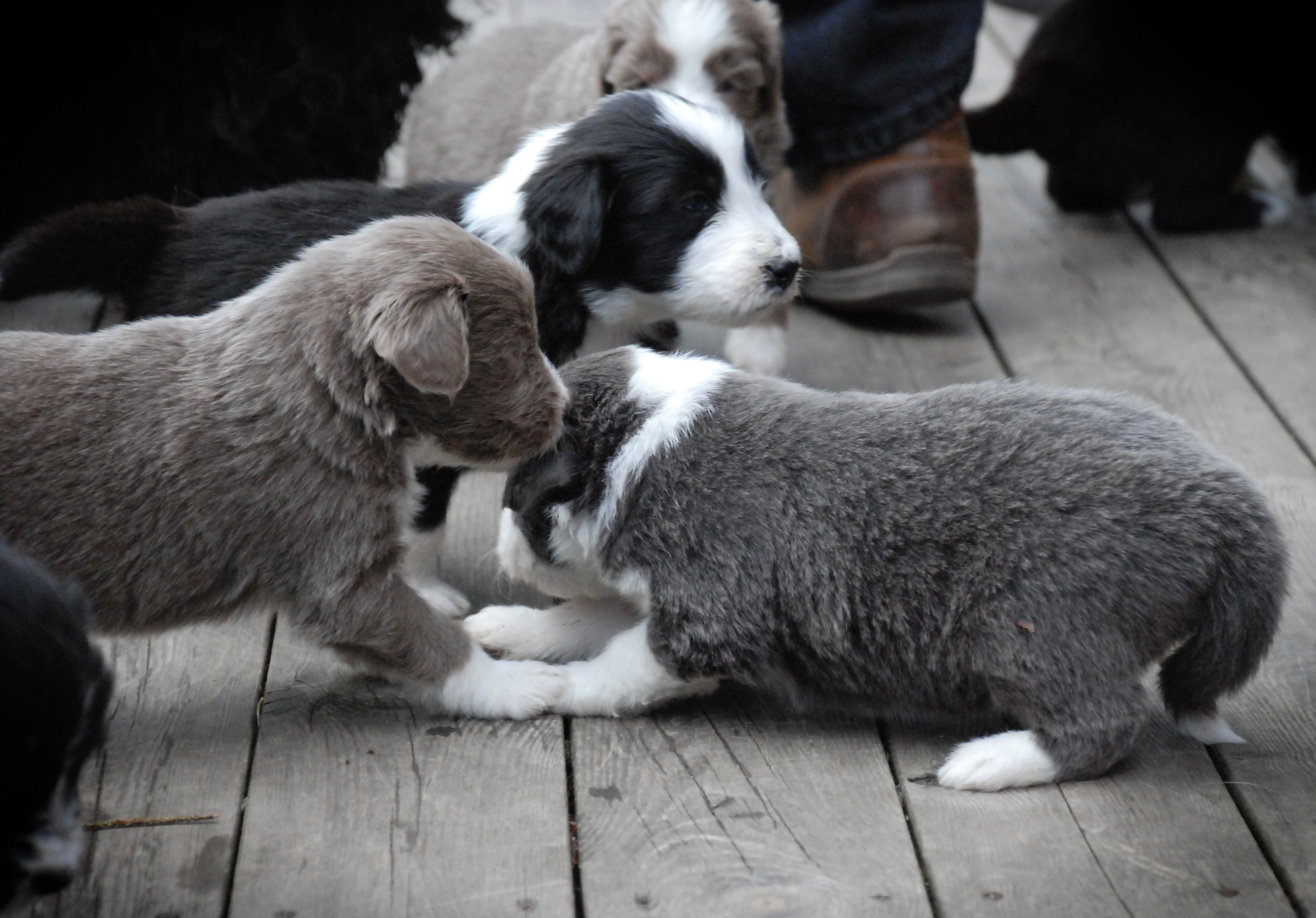 Valparna är 4 veckor gamla och mycket har hänt den sista veckan. Nu ger vi dem extra mat fyra gånger om dagen och de växer så det knakar. Deras tänder har börjat komma så valparna biter i både leksaker och varandra. De springer med mycket bättre balans och kan till och med hoppa. De sover fortfarande mycket, men ibland är det full rulle!
