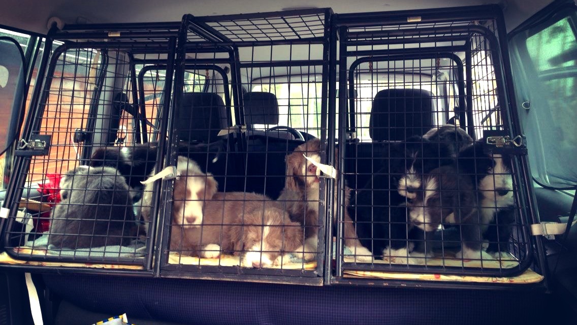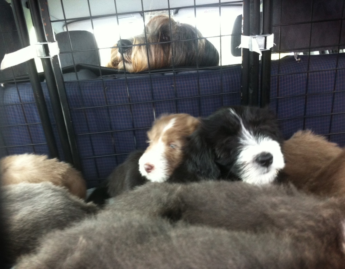 I bilen var de kanske inte lika nöjda. Stundvis var de riktigt missnöjda bak i buren, men sedan somnade de även där. Wilma följde med och satt i baksätet. Där fick hon vara ifred med hade ändå bra koll på valparna. Det blev en dag med många nya erfarenheter för de små.