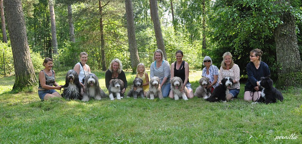 Den 7/7 hade Vallklanen kennelträff på Brukshundsklubben i Falkenberg. Det var över 20 bearded collies som kom. Det var så otroligt roligt att få träffa alla hundar. Från Vallklanens första kull (2010) kom Valle, Ella och Engla. Från Vallklanens 2a kull (2012) kom Angus, Nisse och Zelda. Från Vallklanens 3e kull (2013) kom Freya, Sally, Bea, Bailey, Busan, Malkin och Vera. De sitter också i den ordningen, från vänster till höger, på bilden nedan. Längst till vänster är mamma Wilma och pappa Phille.