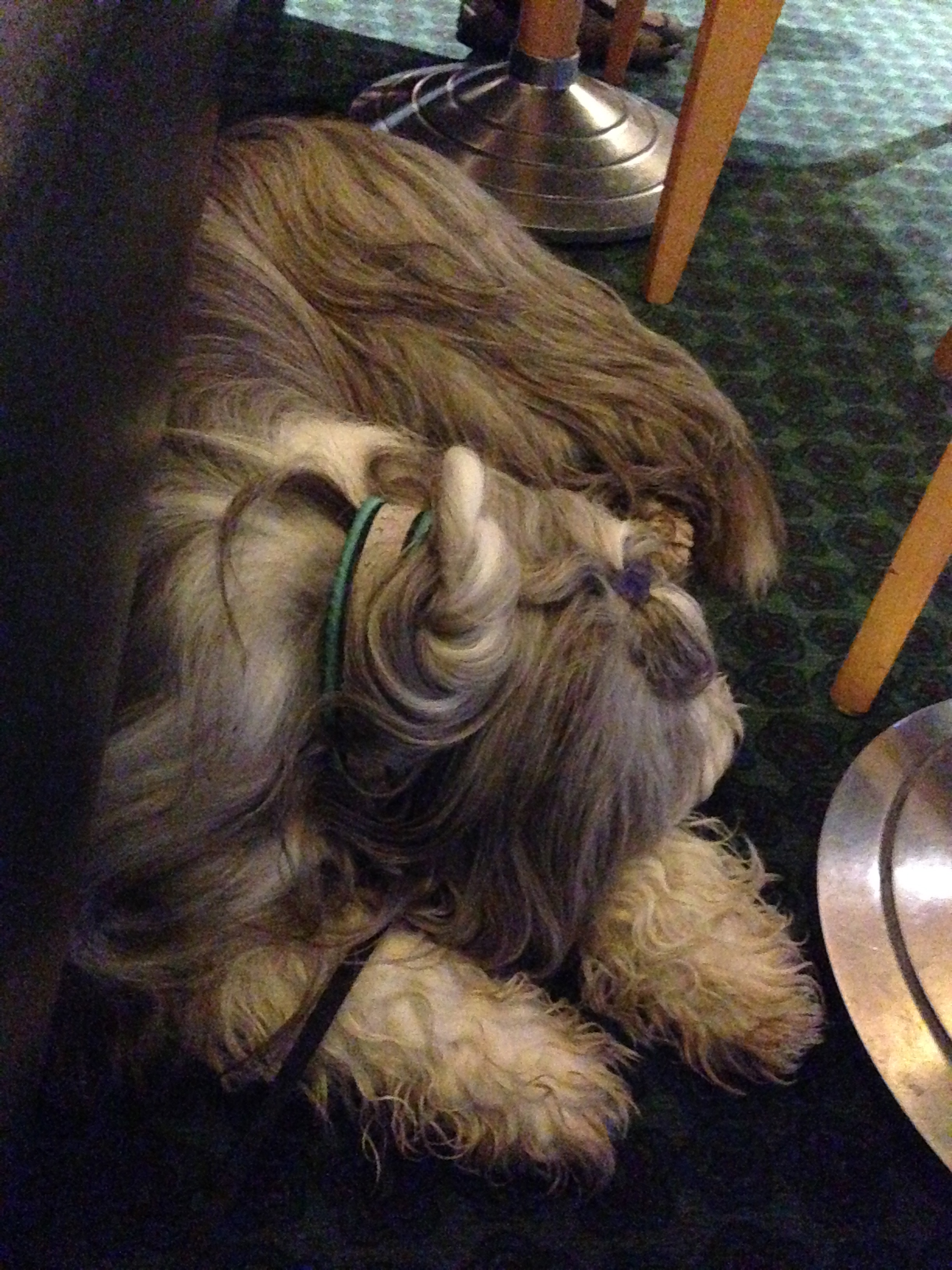 På hotellet var hundarna välkomna i restaurangen. När vi åt middag på kvällarna var alla hundarna med. De var ju trötta efter långa dagar och sov gott under bordet.