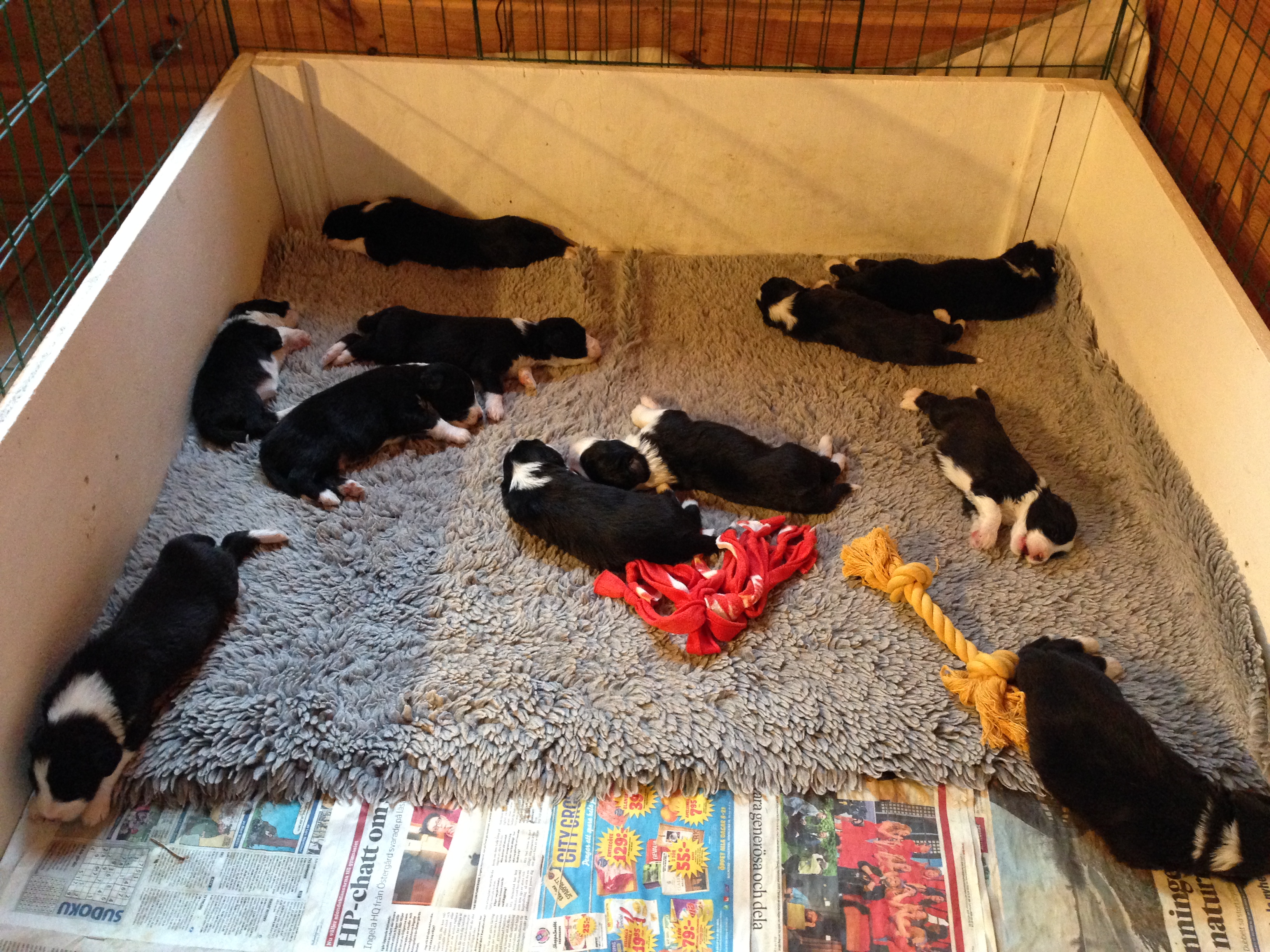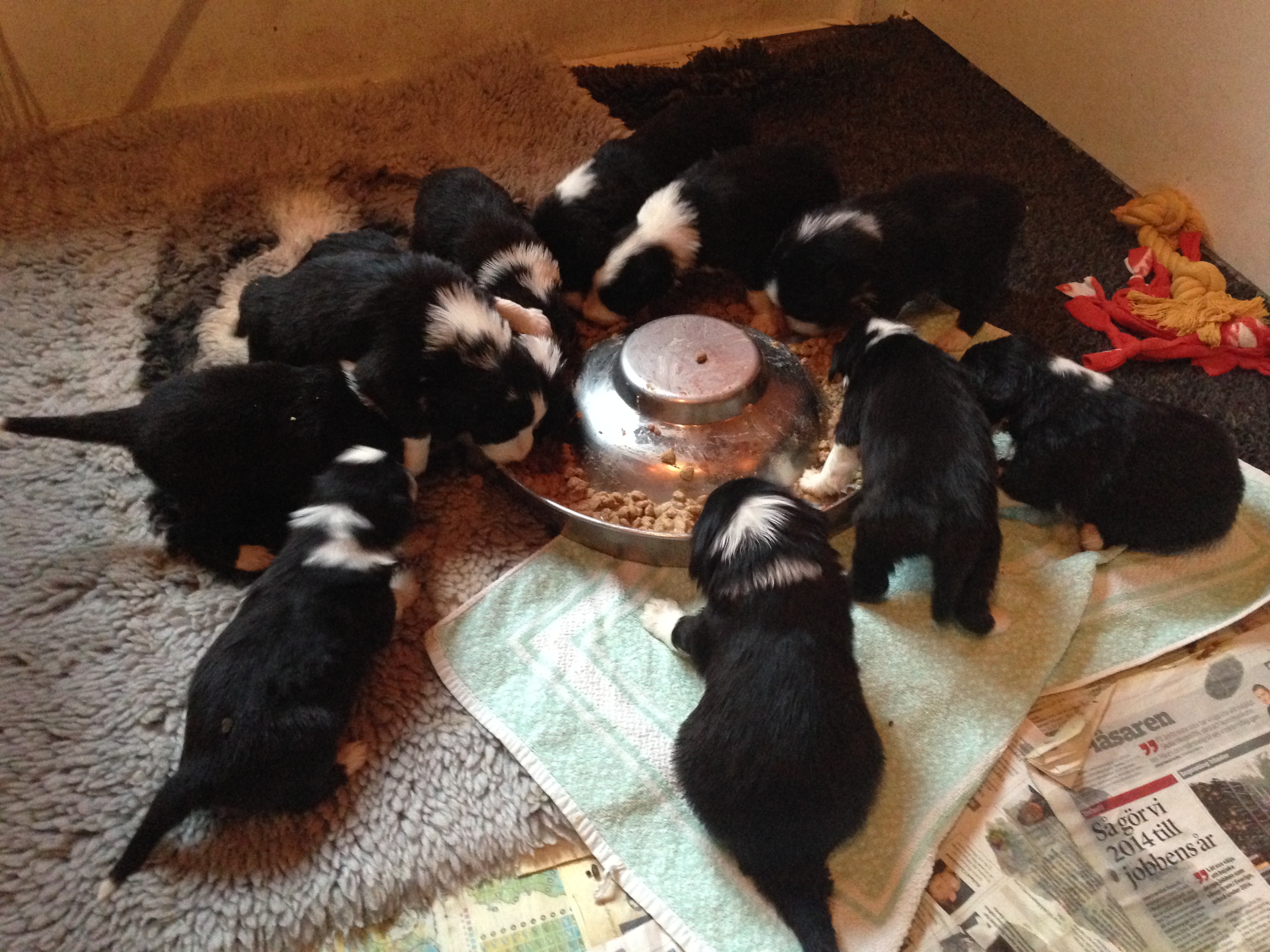 Eftersom de är så många har vi redan börjat ge ”riktig” mat. Det uppskattas av alla valparna. Än så länge får alla plats runt en matskål.