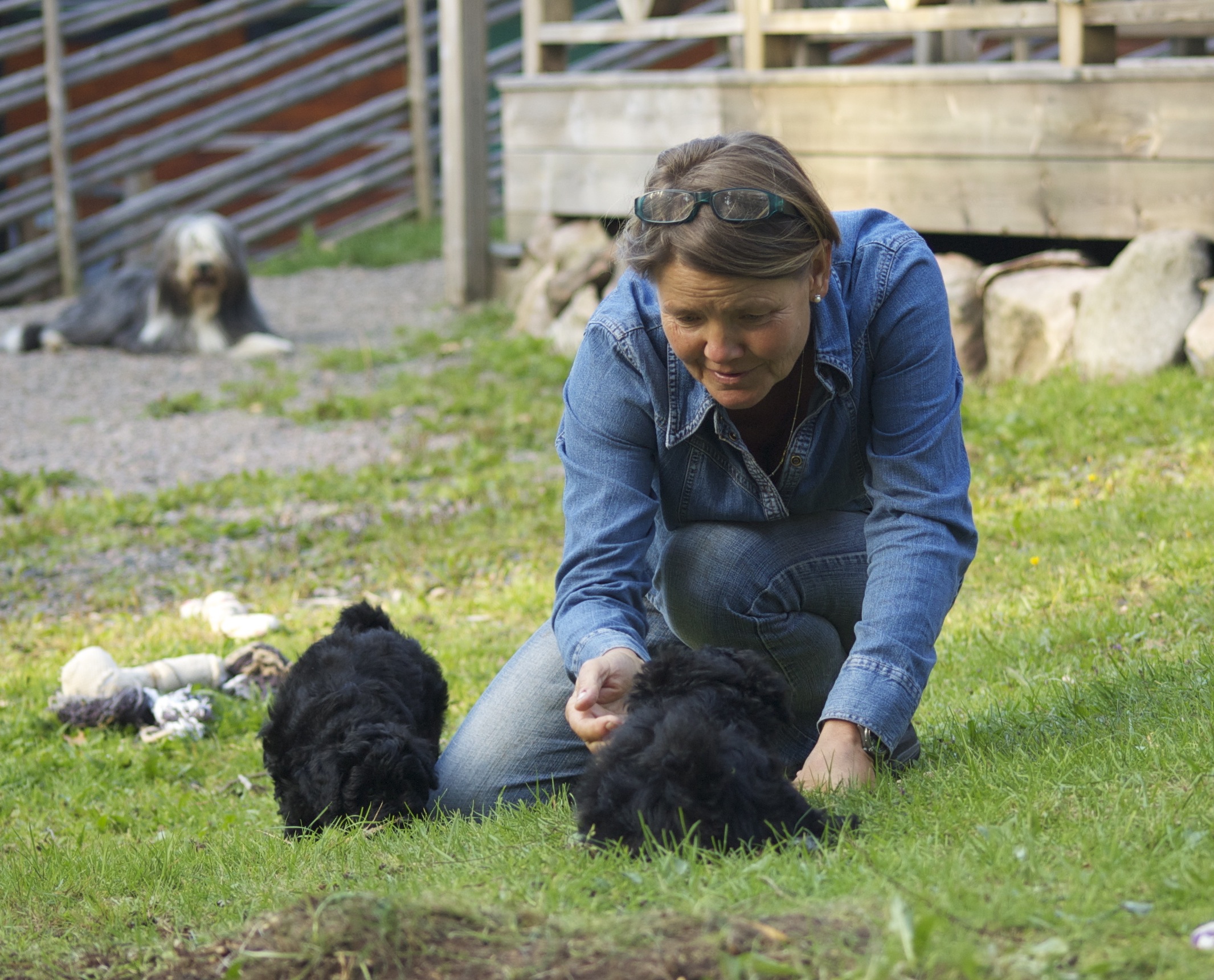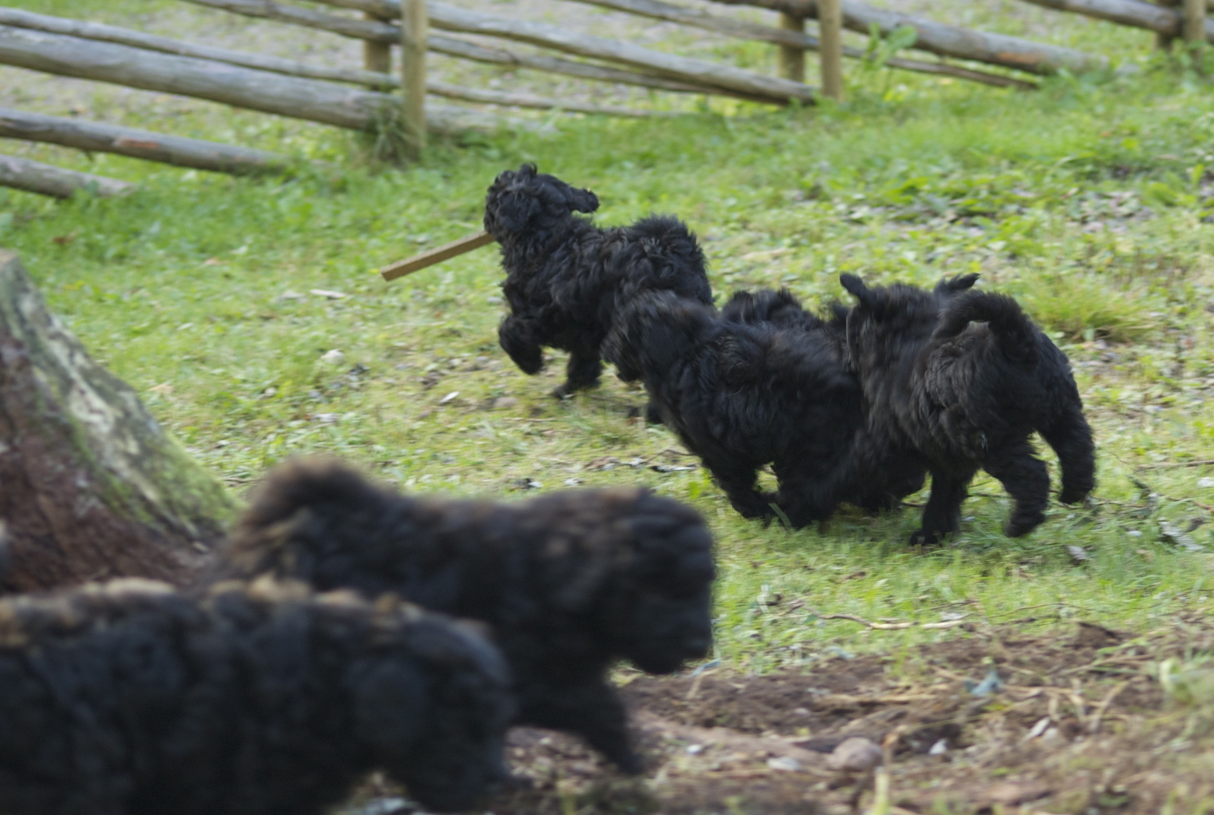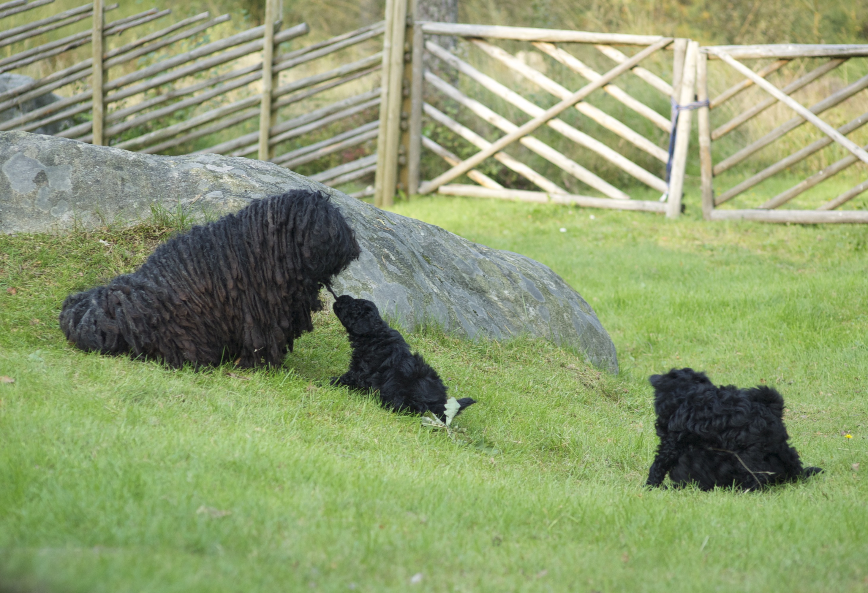 Pulivalparna är snart 8 veckor och det är full fart på dem. De är ivriga att utforska världen. De älskar att kampa, brottas och jaga varandra. De är alerta, hoppar högt, är modiga när de springer genom högt blåbärsris, klättrar upp på stenar och på stubben och sedan slänger sig ut. De bär på pinnar och hundleksaker och retas med varandra. De springer framåt i full fart och vänder sig sedan på en femkrona. Det är riktigt roligt att se hur de utvecklar sin motorik och sitt beteende.