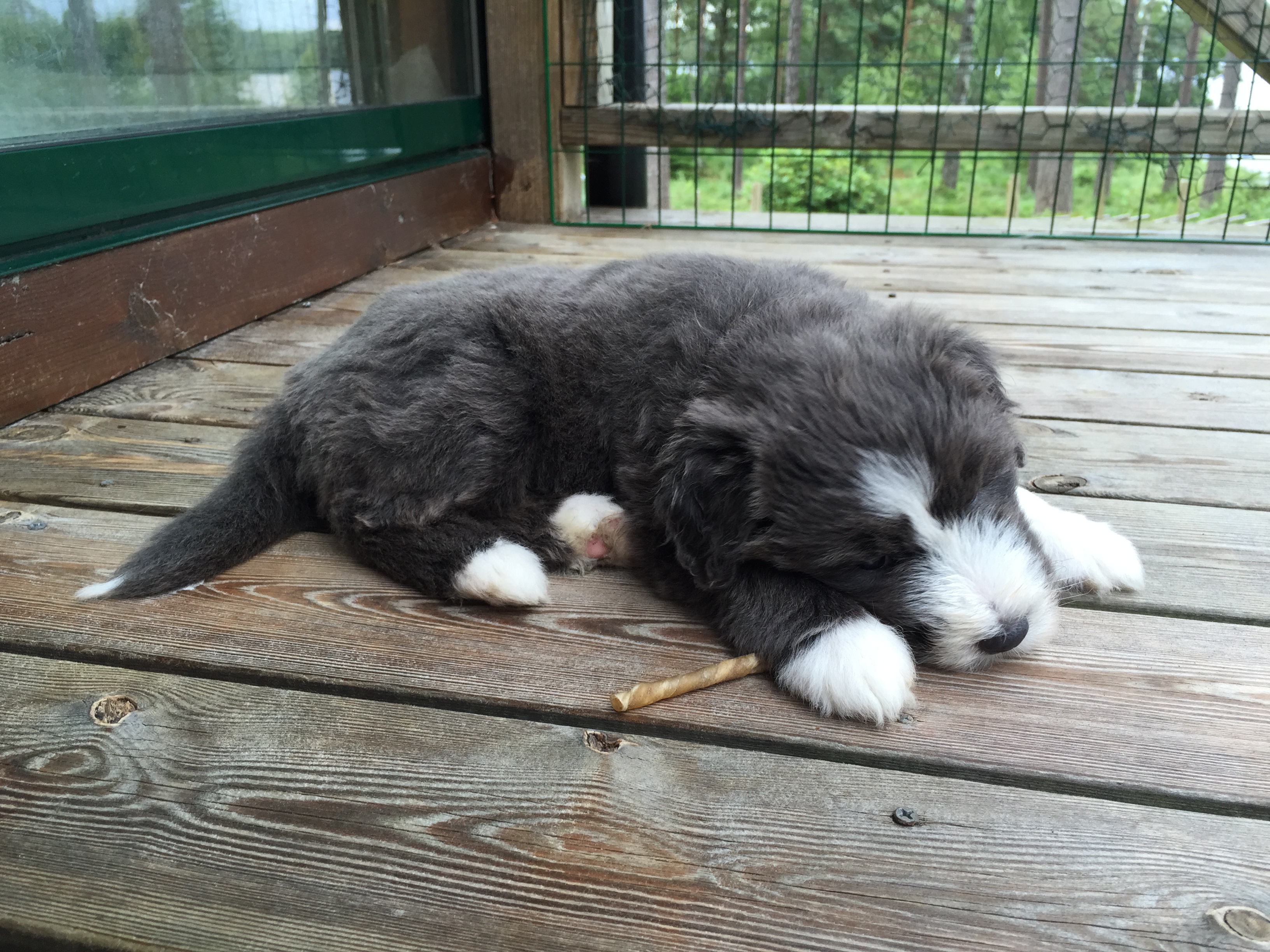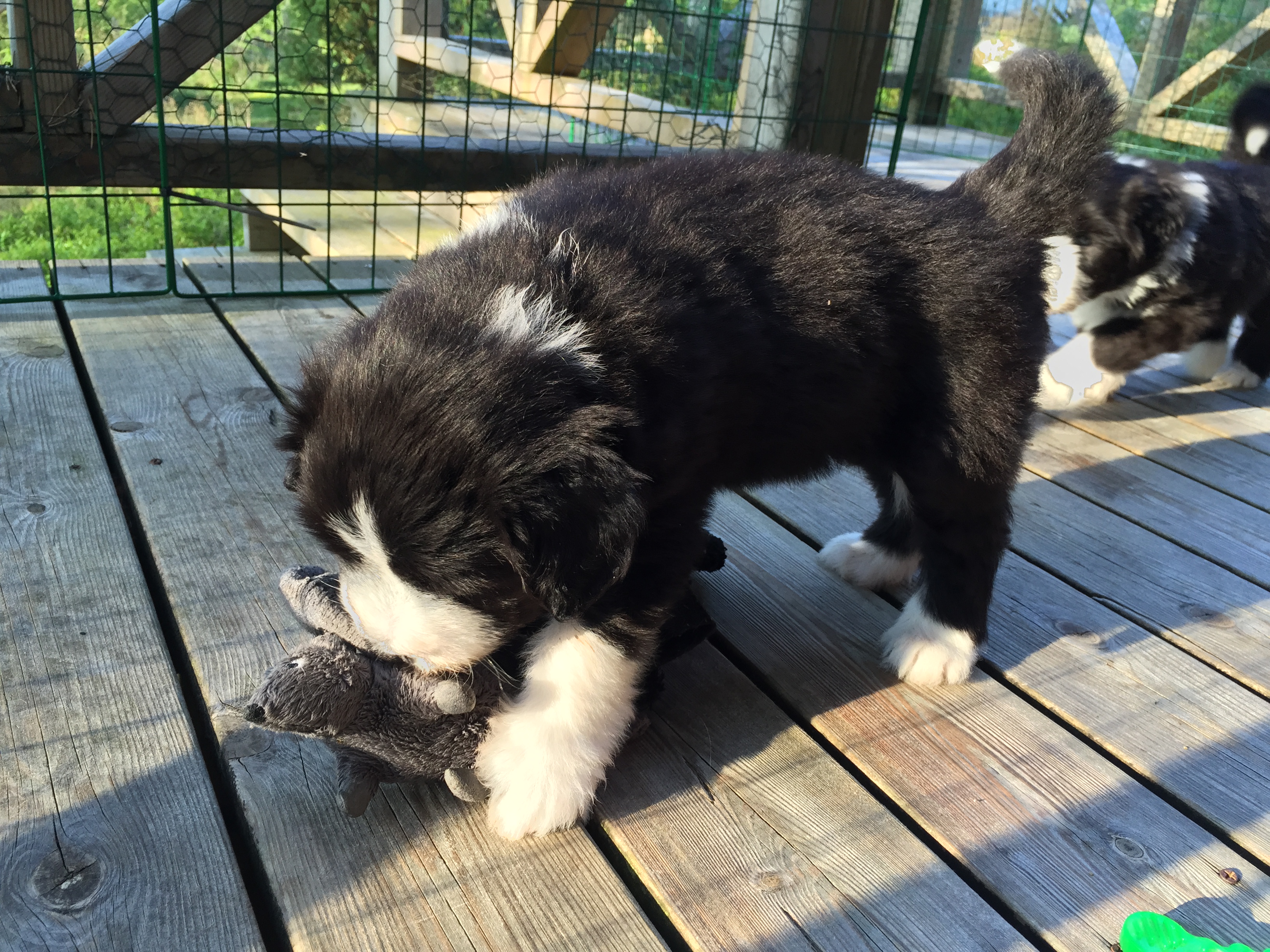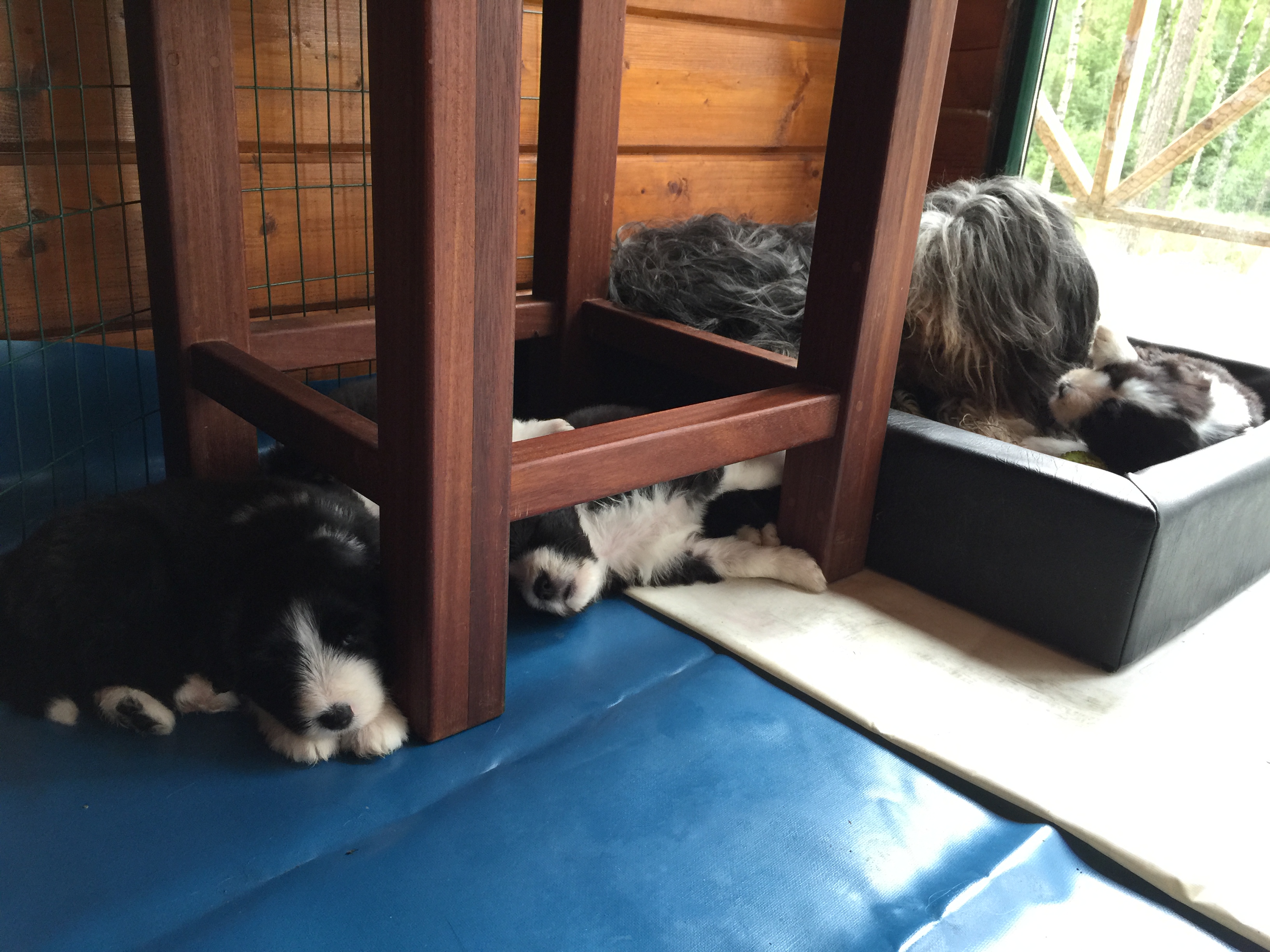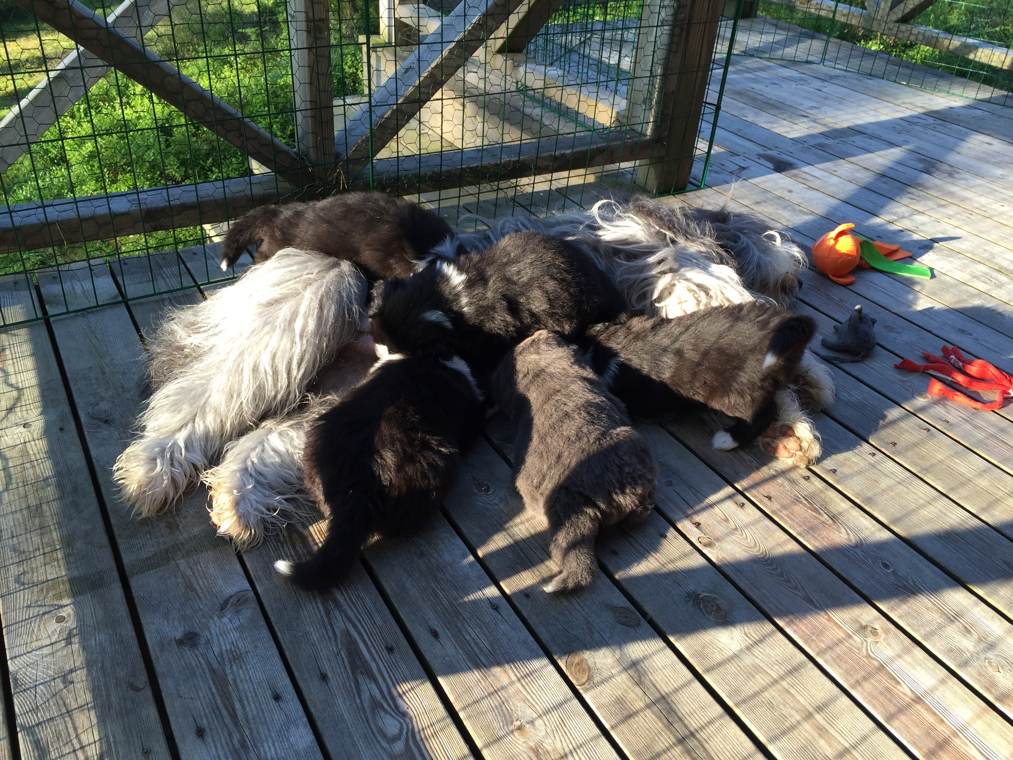 Idag är valparna 5 veckor och idag hade de morgon-mys med sim mamma på altanen. De har vuxit bra och är alla ”små tjockisar”.