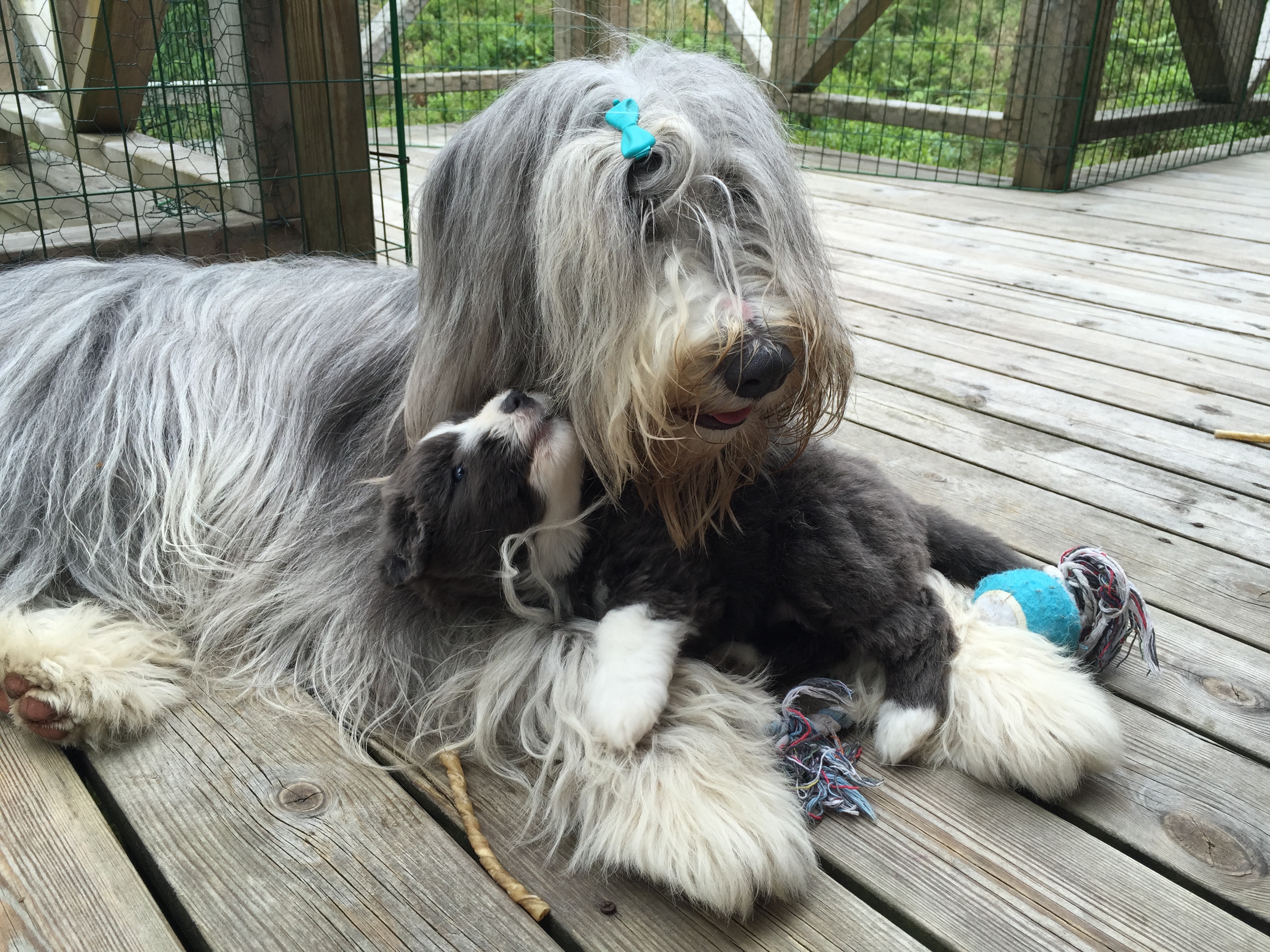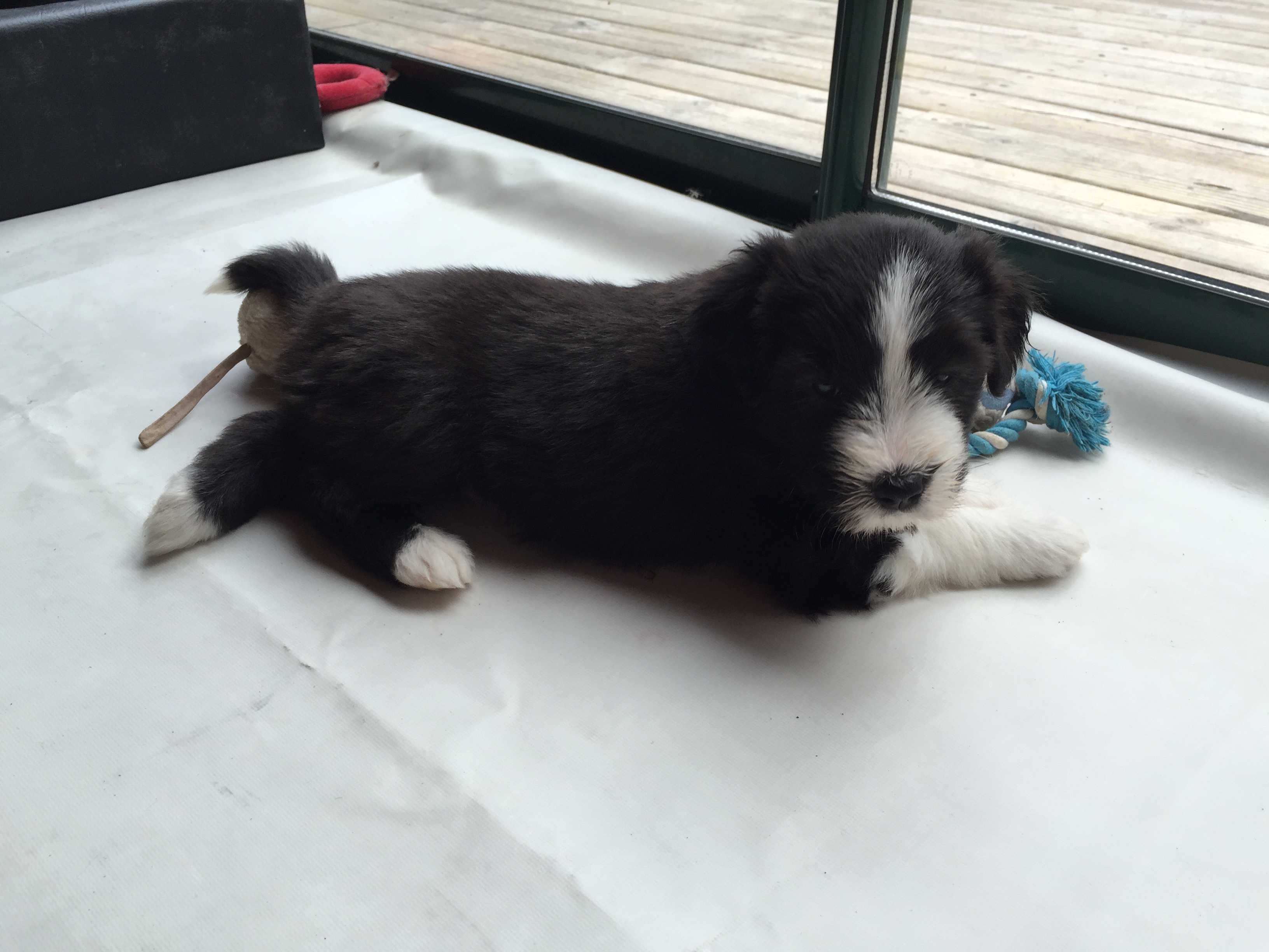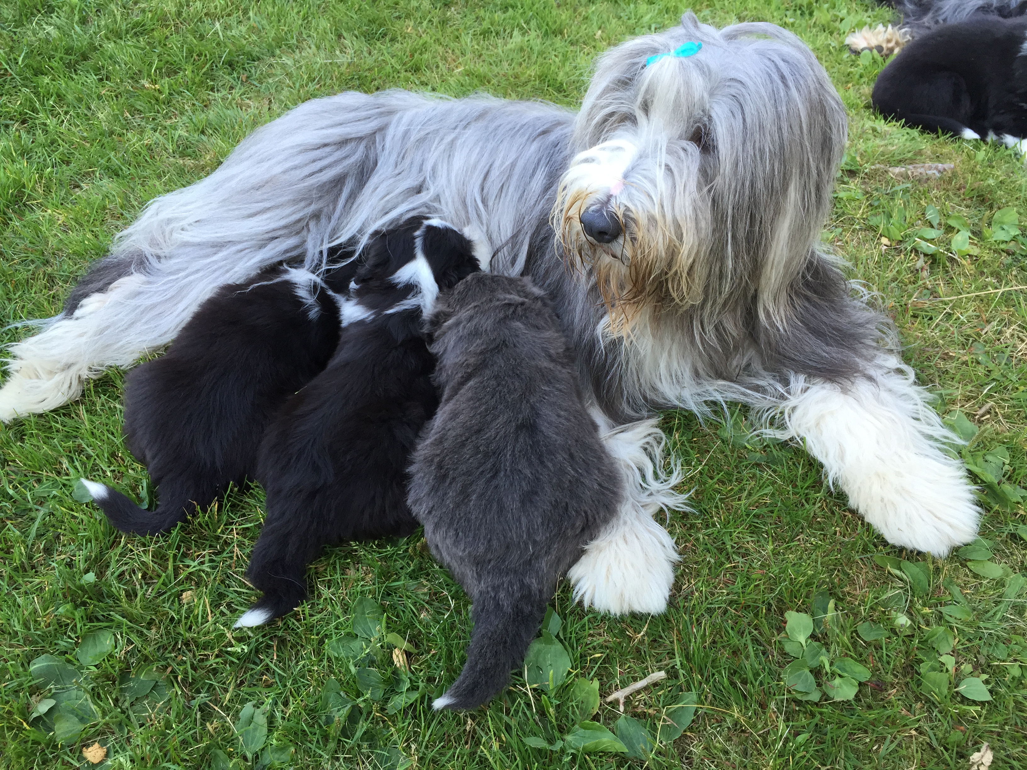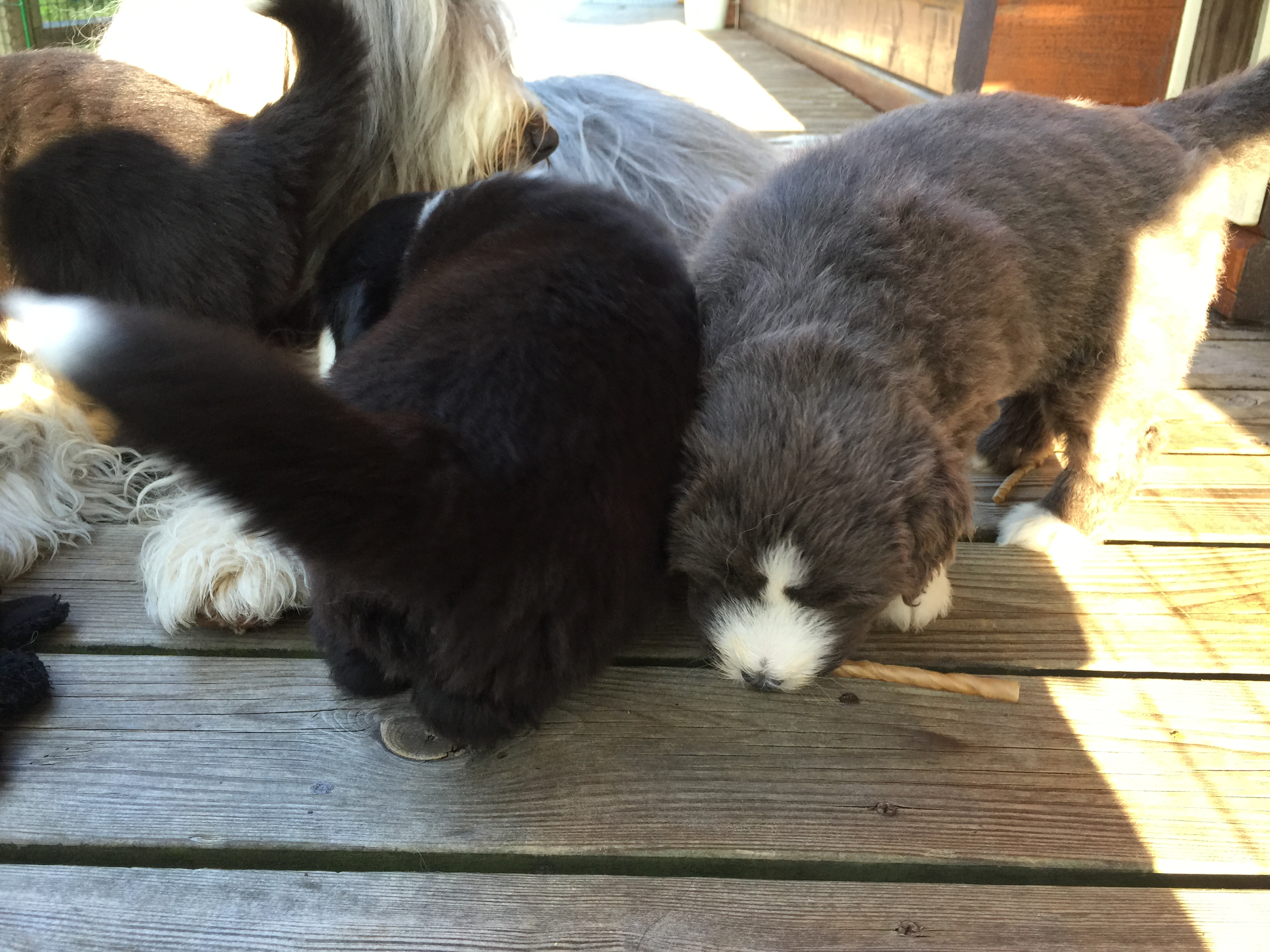 Idag är valparna 5 veckor och idag hade de morgon-mys med sim mamma på altanen. De har vuxit bra och är alla ”små tjockisar”.