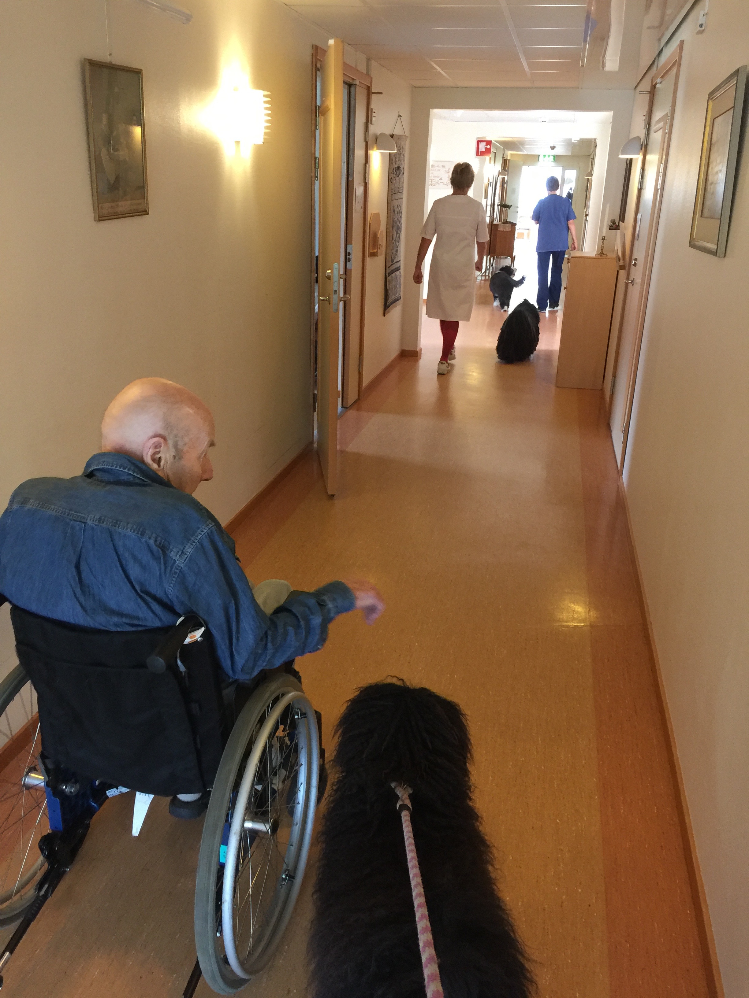 Kafka, Ester och Agnes hälsade på hos Rune, Sonia och många fler på äldreboendet där matte jobbar. Det är alltid lika uppskattat när de kommer. Rune har själv haft hund och vill gärna att de hoppar upp bredvid honom i sängen. Han brukar ofta fråga när jag ska ta med ”den svarte” nästa gång, och syftar då på Ester. Rune är alltid så snäll och frågar hur det är med hundarna och hur det går på alla tävlingar.