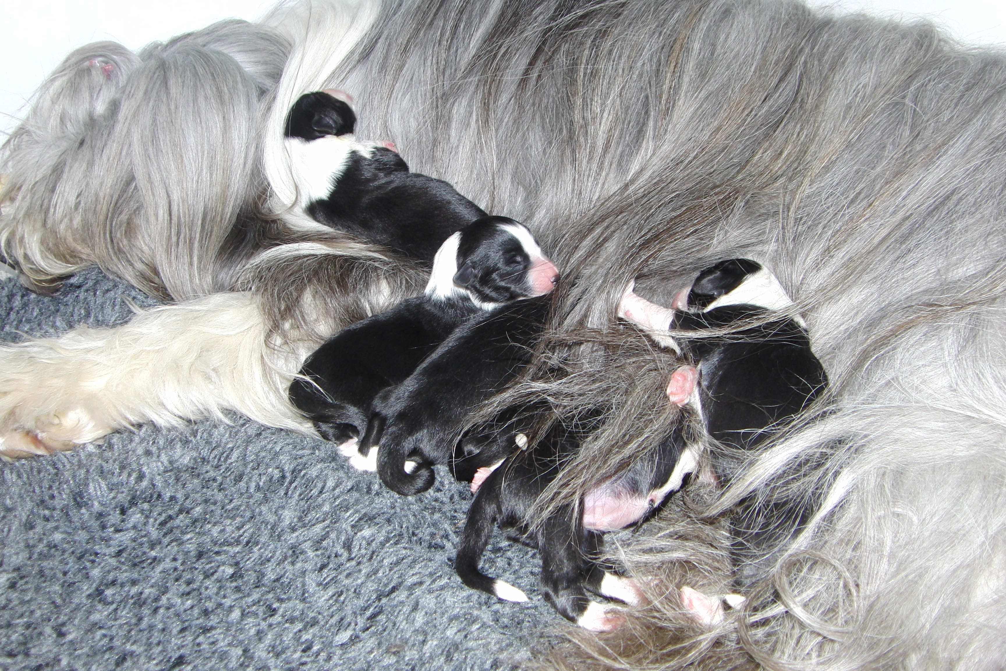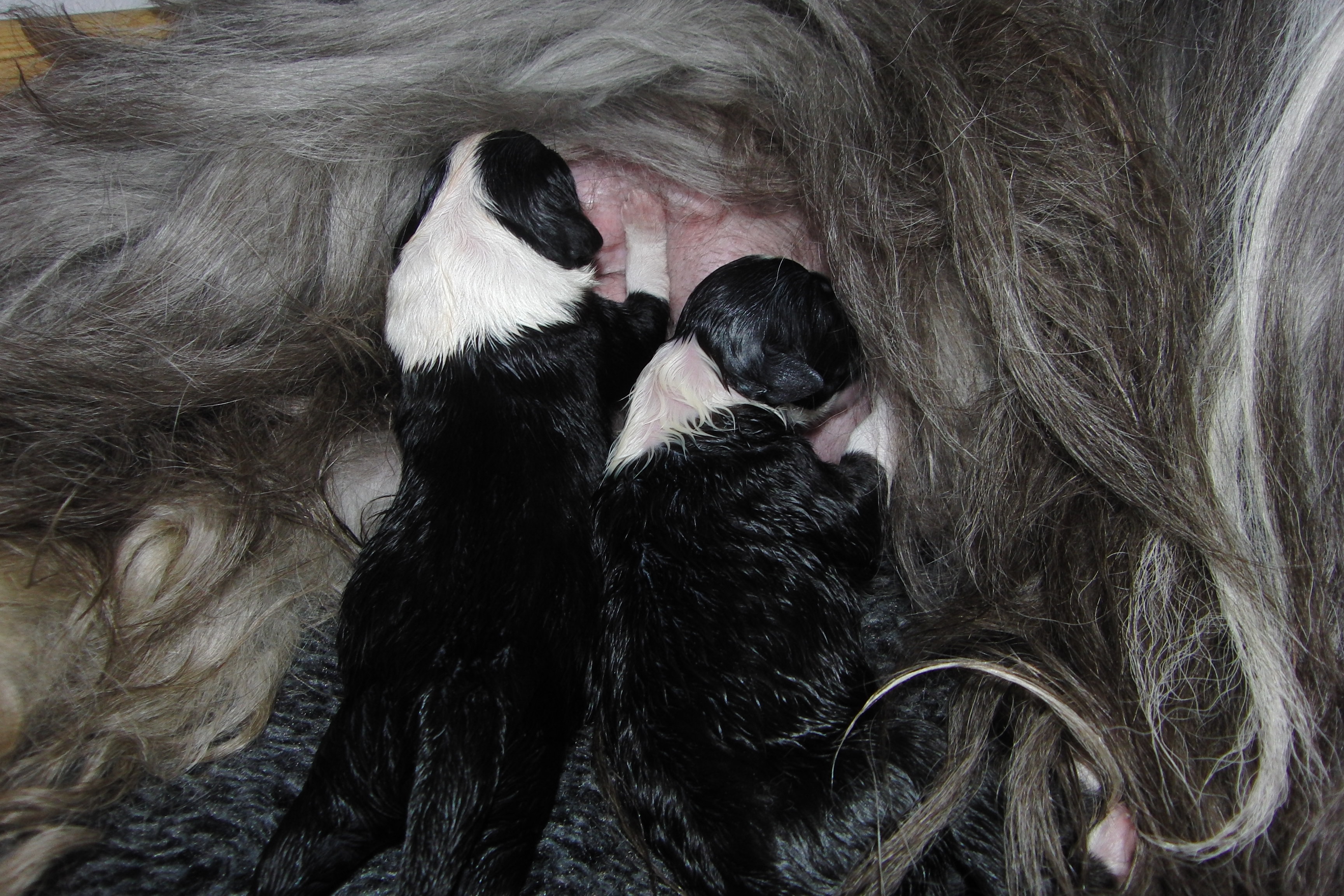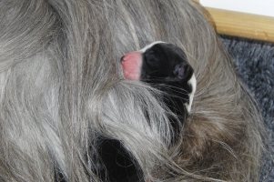 Första hanen föddes kl 05.55. Han vägde 500 gr. Efter 1½ timme föddes den första tikan och hon vägde 385 gr. Sedan blev det en paus. När det gått 2½ timme och inget hänt fick Sally komma ut och kissa. Vi tog en extra sväng i trappan och det hjälpte till. Snart föddes en tik och en hane med bara ett par minuters mellanrum.