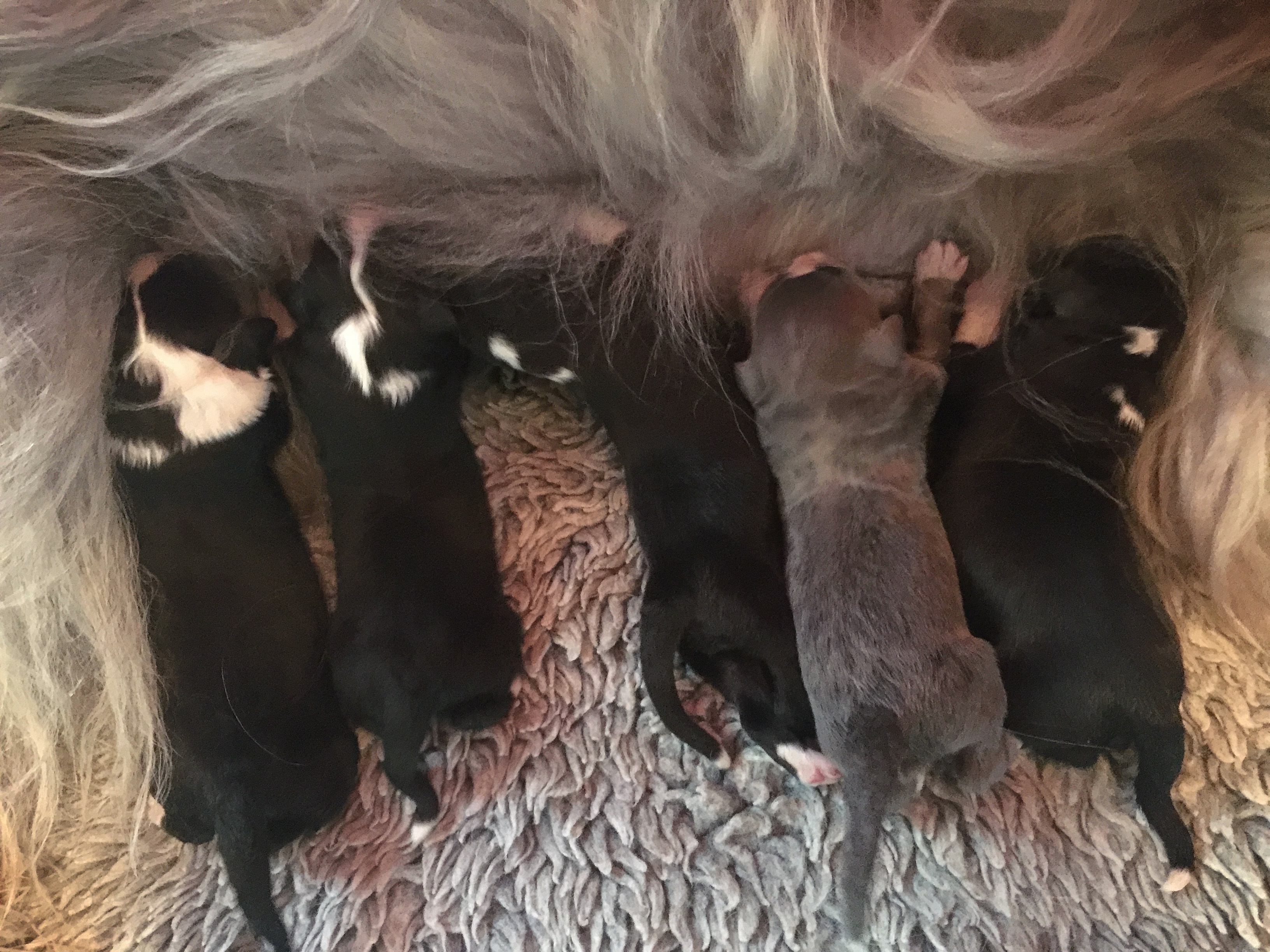 Valparna är 1,5 veckor gamla och än så länge består livet av sömn och mat. De är starkare och rör sig snabbt när mamma Nova kommer till dem i valplådan.  De har ännu inte öppnat ögonen, men det sker snart.  De är alla 5 härligt knubbiga.
